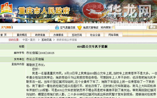 在605公交車上遭偷,求助司機(jī)又受冷遇,只好眼睜睜看著賊娃子脫身,重慶市民熊先生就遭遇了這樣無奈又憤怒的事情。氣憤之余,熊先生提筆向市長(zhǎng)求助。今日,記者在重慶市政府信息網(wǎng)市長(zhǎng)信箱上看到,該信箱公布了熊先生的訴求,有關(guān)部門也已著手解決了熊先生反映的尷尬之事。