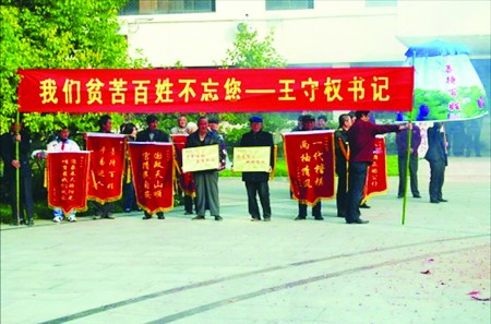 帖子出現(xiàn)在網(wǎng)友“西楚刀客”的博客上。整篇文字介紹了發(fā)生在兩個星期前江蘇省泗洪縣政府樓前的“感人的一幕”:11月13日一大早,數(shù)百名群眾自發(fā)地排著整齊的隊伍,抱著銅匾,撐著“萬民傘”,打著“清官旗”,集中在泗洪縣政府門前,長長的一串鞭炮發(fā)出震耳欲聾的響聲。在這支隊伍里,有老人,有殘疾人,有打工仔,有下崗工人……每個人都在期盼著能再見見他們的恩人——王守權(quán)……得知王書記調(diào)走的消息,當(dāng)?shù)厝罕娪靡环N最古老的感恩方式——萬民傘和清官旗,來為他送行。