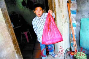 小海平日和父親睡在一張舊式板床上。床板光禿禿的,沒有草席,也沒有墊子。這間潮汕老屋里沒有一件像樣的家具用品。臥室的屋頂早已破舊,陽光從上面的兩個方孔斜射下來,照在床邊。奶奶說,家中最新的東西,就是那部固定電話,不過現(xiàn)在已經(jīng)停機了。記者在屋里發(fā)現(xiàn)了小海的“書包”。其實根本稱不上是書包,而是一個紅色的透明薄膜塑料袋。里面裝著幾本破舊的書,還有一沓試卷。