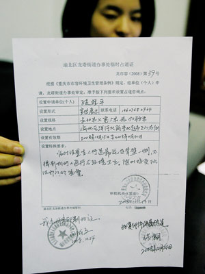 昨天下午,記者在觀音橋街道辦看到了張出示的那張《占道證》,全稱是龍市容(2008)第39號《渝北區(qū)龍塔街道辦事處臨時占道證》,印章蓋的是“渝北區(qū)市政綜合行政執(zhí)法局龍塔大隊”,發(fā)證時間為2008年10月13日!