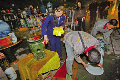 昨日,江北區(qū)洋河北路,執(zhí)法人員對40多件瓷器實施暫扣 記者 劉嵩 攝
