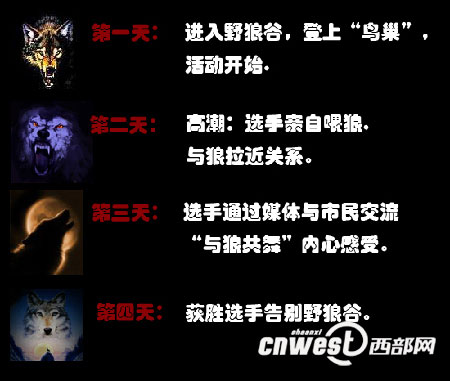 據西安秦嶺野生動物園負責人任飛翔介紹,該園將在陜西省內招募三名年齡在二十二歲至四十五歲之間,寫作能力強,善于使用照相機、攝像機,膽量過人且有一定戶外生存經驗的男士,于十二月八日進入野狼谷指定活動區(qū)域——酷似“鳥巢”的茅草棚居住三天。 期間吃、喝、拉、撒、睡均在“鳥巢”里度過。要求他們記錄下野狼的活動規(guī)律、生活習性、等級序列、幫派體系,以及狼與狼之間的情愛恩怨,狼與人之間的關系和挑戰(zhàn)者的感受。按要求完成挑戰(zhàn)任務者,將獲得五千元人民幣獎金,并頒發(fā)榮譽證書。
