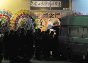 昨晚,昭通市昭陽區(qū)殯儀館燈火通明,擺滿了祭奠凌光輝的花圈,多數(shù)為政府機關(guān)所祭,市、縣兩級相關(guān)領(lǐng)導(dǎo)干部及凌光輝的親戚朋友在等待著凌光輝的靈車。直到晚8點,靈車才開進(jìn)殯儀館,警車開道,一輛急救專用車載著凌光輝的靈柩進(jìn)入殯儀館,15分鐘后,把靈柩安放進(jìn)靈堂。