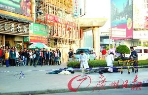 據目擊者講,當該男子從100多米高空跳下時,一老漢卻騎著自行車闖進了警戒區(qū),正好被砸中,頭重重地摔在了旁邊花壇的石階上,血流不止。而跳樓的男子也當場氣絕身亡。隨后,120急救人員馬上將被砸中的男子送往醫(yī)院急救。昨晚6時50分許,記者趕到常平醫(yī)院重癥病房時,被砸中的老人已宣布不治身亡。