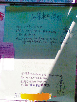 “太強悍了,圣誕節(jié)愛情宣言竟然貼到了我們女生宿舍的宣傳欄上!”江南大學(xué)一名女大學(xué)生向記者報料稱,該校北區(qū)女生宿舍樓下的宣傳欄里出現(xiàn)了一張張名為“水果攤情緣”的“很強大”的求愛海報。