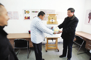 捐贈(zèng)儀式上,張金寶代表同伴們從蔣卓平手中接過(guò)了畫(huà)筆等繪畫(huà)材料,兩年來(lái)他想繼續(xù)畫(huà)畫(huà)的心愿終于實(shí)現(xiàn)了。對(duì)最具天才的張金寶來(lái)說(shuō),他并不著急動(dòng)筆,他摸摸自己腦袋告訴記者說(shuō):“好長(zhǎng)時(shí)間不畫(huà)了,腦子有點(diǎn)空,畫(huà)什么我要再想想……”