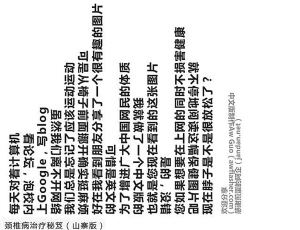 蘇小姐在南京棲霞區(qū)新港開發(fā)區(qū)一家公司做文職工作,25歲的她長期和電腦打交道,每天伏案上網(wǎng)最少十小時以上。近段時間,常常自述頭暈、目眩,肩頸部每天酸痛得很,右手有時拿著物品都會不自覺地掉落下來。去醫(yī)院檢查,被告知是頸椎長了骨刺并有韌帶鈣化,屬于頸椎病,需做綜合治療。前幾天,蘇小姐在網(wǎng)上看到一篇自翊為“山寨版治療頸椎病”的帖子,文字左右顛倒,需要上下左右不停地搖頭晃腦才能看清網(wǎng)上帖子的全部內容,從而起到治療頸椎病的作用。