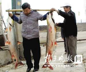 昨天上午,老胡請(qǐng)來漁民用魚網(wǎng)對(duì)5年來從未捕撈的魚塘進(jìn)行捕撈。魚網(wǎng)撒下去不到兩分鐘,就從水面上傳來嘩啦啦的水浪。岸上人一看,只見水中的魚網(wǎng)被水下白色物體咬住了,大家一起拉網(wǎng),網(wǎng)下掀起層層的水花,兩條漁船迅速合并,幾名漁民聯(lián)手協(xié)力,用了半個(gè)小時(shí),才將魚網(wǎng)拽住。這時(shí),兩條一米多長(zhǎng)的大魚一番折騰后耗盡了力氣,全身纏著魚網(wǎng),露出了發(fā)白的肚皮。