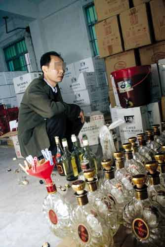 在中山市西區(qū)金葉市場(chǎng)的一個(gè)窩點(diǎn),搜查人員在倉(cāng)庫(kù)中搜出大量假冒洋酒和假冒國(guó)產(chǎn)名酒。同時(shí)繳獲的賬本顯示,許多假酒都賣給了市內(nèi)一些酒店和KTV、酒吧等娛樂(lè)場(chǎng)所。據(jù)制假的“老板”交代,他們收購(gòu)廉價(jià)洋酒后,再勾兌色素灌入洋酒瓶,一分鐘就能生產(chǎn)一瓶“洋酒”。冒牌國(guó)產(chǎn)“名酒”,也是勾兌廉價(jià)國(guó)產(chǎn)白酒做成的。