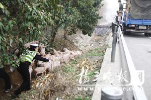 原來(lái),當(dāng)日一輛懸掛湖北牌照的倉(cāng)柵式貨車運(yùn)了300頭小豬,經(jīng)寧合高速公路由江蘇灌云開往湖北黃石。在途經(jīng)南京浦口侯莊跨線橋路段時(shí),該車右后輪突然發(fā)生爆胎,車輛側(cè)翻在路上,裝豬的籠子遭路邊護(hù)欄撞擊全部破了。受驚的小豬崽們趁機(jī)“越獄”,在高速公路上狂奔。