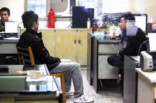 昨天下午4點(diǎn),記者在較場口派出所的詢問室外,隔著玻璃看到了這名小伙子。他身高大約1.65米,身穿黑色冬衣,栗黃色的頭發(fā)十分蓬亂,臉上和脖子上臟兮兮的,目光有些呆滯。