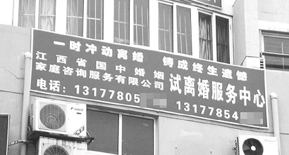 “一時(shí)沖動(dòng)離婚,鑄成終生遺憾!苯眨魇∧喜斜本〇|路京城大廈外墻懸掛的一塊大型廣告牌,吸引了過(guò)往市民的注意。做廣告的不是婚姻調(diào)解機(jī)構(gòu),而是一家“試離婚”服務(wù)中心。