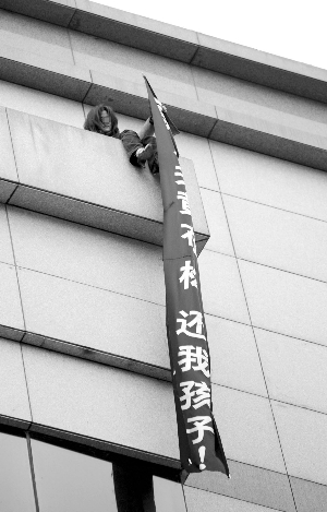 記者看到,一名身穿紅色外套的年輕女子,正坐在樓頂外墻伸出的一小塊天臺(tái)邊緣,垂著頭發(fā),兩腳懸空,一只手抓著手機(jī),另一只手拉著一條條幅,上面寫(xiě)著“還我孩子”等幾個(gè)白色大字。圍觀的人越來(lái)越多,記者回頭望去,只見(jiàn)淮海路一側(cè)的自行車(chē)道上,整片黑壓壓的腦袋。
