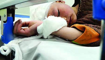 另一個(gè)受害孩子的家長(zhǎng)楊旗中正趴在ICU病房的門(mén)口,兒子楊自炎剛動(dòng)完腦部手術(shù)。為了防止孩子亂動(dòng),兩只小手被捆在了床旁的護(hù)欄上。