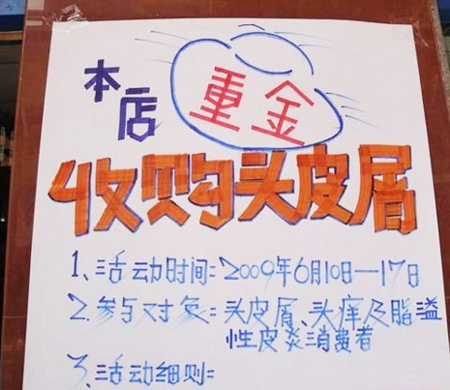 在朝聞網(wǎng)、搜狐社區(qū)、新浪論壇上,一篇名為《暴強(qiáng)!藥店竟然收購頭皮屑》的帖子,引發(fā)網(wǎng)友熱議。帖中說,自己在經(jīng)過住地附近的一家藥店時看到,店門口竟貼出一張海報要收購頭屑!這可怎么算,按斤稱?論兩算?不是,是以片兒算,店方開出了每片頭屑100元的天價。樓主驚嘆,見過收廢品收古董啥的,“這回我真是被雷著了!我看這藥店老板肯定是個腦殘,還不如直接送錢好了……”