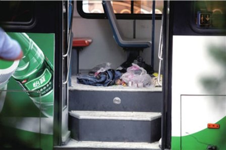 記者看到,公交車前車門處滿是灰色粉末,一條淡藍(lán)色牛仔褲、一袋蘋果和一些塑料袋堆在車門附近。附近居民猜測(cè),那里正是嫌疑人意圖縱火的位置,“警察一直在那附近拍照,那些東西可能也是救火時(shí)留下的。”