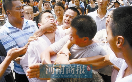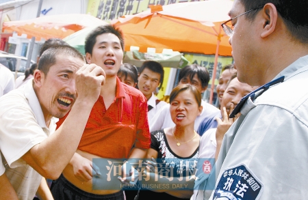 這時(shí)又沖來(lái)一中年男子,與執(zhí)法隊(duì)員撕扯起來(lái),場(chǎng)面一片混亂。一攤販告訴記者,這人是朱林的丈夫,姓許,信陽(yáng)固始人,兄妹八人都在附近做生意。這一帶賣(mài)水果的都是信陽(yáng)老鄉(xiāng),來(lái)鄭做生意已有十多年。