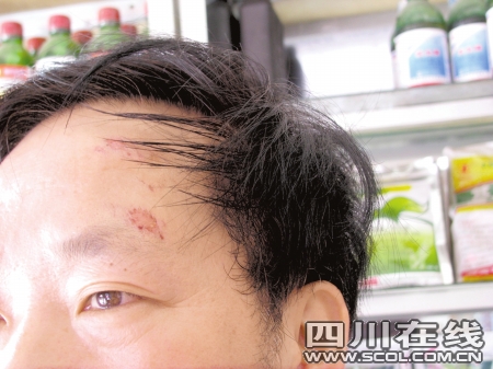 23日上午10點半,記者來到位于旭陽鎮(zhèn)北街的農(nóng)資店,見到了李信良。這名穿著白色T恤的中年男子左上額的擦傷已經(jīng)結疤,上嘴唇還有淤青,他拂起衣袖,情緒有些激動地說:“看嘛,左手臂這里還有一大塊青的!”