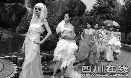 活動(dòng)現(xiàn)場(chǎng),七八名大學(xué)生美女志愿者身穿五顏六色,用紙袋、塑料袋、筷子和孔雀羽毛等奇異材料制成的服裝為游客們獻(xiàn)上了一場(chǎng)別出心裁的時(shí)裝秀,向每一位游客宣傳環(huán)保理念。據(jù)了解,這些紙裝是武漢一高校服裝設(shè)計(jì)專業(yè)的學(xué)生精心制作的,他們希望和成都的同學(xué)共同呼吁市民愛護(hù)環(huán)境。來自武