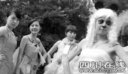 “怎么把眼睛和鼻子都涂黑了呀?哦!原來是熊貓模特兒,看,身上還畫了竹子呢!”昨日上午,在成都塔子山公園鳥語林,一位美女模特頭戴白色假發(fā),眼睛、鼻子都被涂成黑色,把自己裝扮成一只大熊貓。除了這種人體彩繪,參加活動(dòng)的大學(xué)生志愿者還表演了一場(chǎng)精彩的環(huán)保紙裝秀,她們用這種健康、綠色、和諧的方式來向大家倡導(dǎo)環(huán)保理念,吸引了眾多游人觀看。