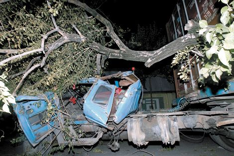 一旁,一個樹杈壓在貨車駕駛室上,使其嚴重變形,風擋玻璃全部破碎。一棵直徑約0.8米的大樹倒在人行道上,樹根部已經腐爛,樹冠將馬路占去了四分之三。