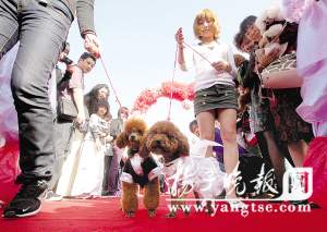 昨天,兩只身穿結(jié)婚禮服的寵物狗正在領(lǐng)取結(jié)婚證。當(dāng)天,南京首屆寵物集體婚禮在南京綠博園內(nèi)舉行。15對(duì)寵物狗“新人”伴隨著婚禮進(jìn)行曲逐對(duì)踏上紅地毯。狗狗們不但領(lǐng)取到寵物結(jié)婚證書,還互相贈(zèng)送了愛(ài)情信物。據(jù)悉,寵物集體婚禮在南京尚屬首次,別開(kāi)生面的婚禮現(xiàn)場(chǎng)吸引了不少市民前來(lái)捧場(chǎng)。圖為一對(duì)可愛(ài)的泰迪犬夫妻領(lǐng)到了結(jié)婚證。 (周曼 宋嶠)