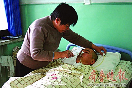 每天一大早,要用濕毛巾給李傳華擦手、擦臉,然后喂他吃飯。她把雞蛋、饅頭或者油餅、油條,以及小米粥,全部摻在一起,用果汁機打碎,用大號的注射器從胃管里打進去。每一口飯、一口水的涼熱,她都要先嘗一嘗。