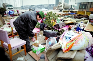 昨日上午9時(shí)許,百子灣家園東側(cè)空地上圍起警戒線。四五十名住戶不肯離去,身旁堆著鍋碗瓢盆、被褥、衣物等!胺孔颖徊鹆耍砩隙疾恢∧膬!币晃粙D女坐在自家被褥上哭了起來。她懷中3歲女孩穿著單薄毛衣,凍得直流鼻涕。