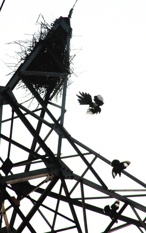 “一個(gè)原本是喜鵲筑好的窩,卻引來(lái)‘同行’八哥的爭(zhēng)奪,喜鵲、八哥兩路人馬一共四只鳥展開(kāi)了爭(zhēng)奪,戰(zhàn)爭(zhēng)持續(xù)了10來(lái)天,到現(xiàn)在也沒(méi)有結(jié)果!弊蛱焐衔,家住南京下關(guān)水關(guān)橋附近的居民武先生向記者報(bào)料,并講述了發(fā)生在他家附近一座電線架上的一幕幕“鳥類戰(zhàn)爭(zhēng)”場(chǎng)景。