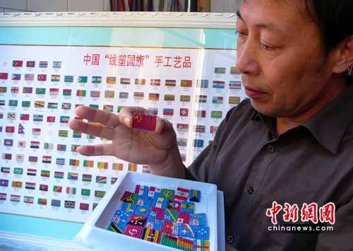中新網(wǎng)4月30日電(馮文芳)為迎接舉世矚目的上海世博會(huì),山西侯馬工程師郝建安用直徑為0.78毫米的彩色電纜線,制作出方寸大小的世界各國國旗,喜迎上海世博會(huì)。他編制的國旗結(jié)構(gòu)緊湊,造型嚴(yán)謹(jǐn),微觀寫意,巧妙夸張,富有立體感。