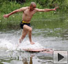 獨(dú)竹漂又被稱為“水上芭蕾”。記者在表演現(xiàn)場看到,隊員將長7.5米,寬15厘米的的獨(dú)舟放入水中,然后腳踩獨(dú)舟,手執(zhí)4.5米的劃桿,悠閑地在湖面上做起了各種高難度動作:一會兒隊員們做著俯臥撐、一會兒又表演金雞獨(dú)立和隊列變換,引來岸邊觀眾的不斷喝彩。(表演隊員):人在江湖漂,哪能不挨刀,為啥不挨刀,咱會獨(dú)竹漂….
