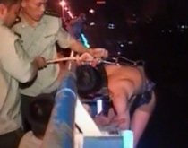 這名男子得手之后,企圖奪路而逃?删驮谒R上就要跑出銀行的一霎那,一名銀行安保飛身撲了過去,把他按倒在地。