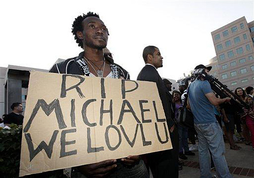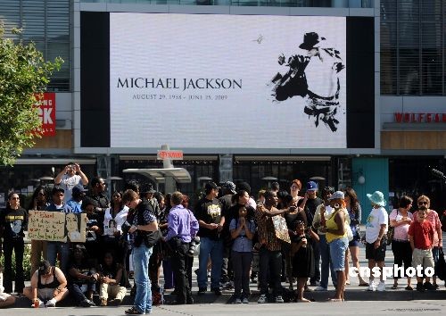 圖:歌迷在追悼會(huì)場(chǎng)外共同悼念邁克爾·杰克遜