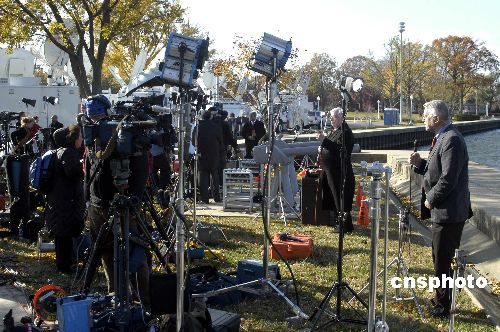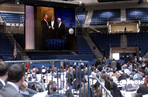 各方關(guān)注的中東和會當(dāng)?shù)貢r(shí)間十一月二十七日十一時(shí)在美國馬里蘭州安那波利斯的美國海軍學(xué)院開幕。在美國總統(tǒng)布什的主持下,巴勒斯坦民族權(quán)力機(jī)構(gòu)主席阿巴斯和以色列總理奧爾默特的雙手緊緊握在一起,現(xiàn)場響起了熱烈的掌聲。中新社發(fā) 邱江波 攝