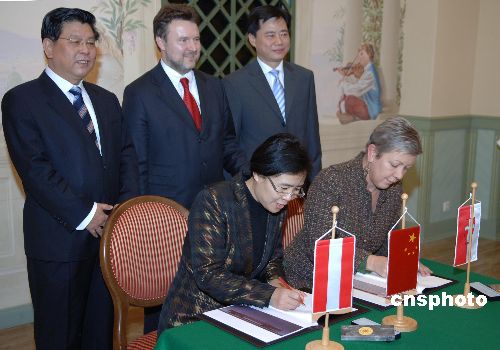 11月30日,維也納中國文化中心項(xiàng)目的簽字儀式在維也納市政廳舉行。中國文聯(lián)書記胡振民(后排左一)、中國駐奧地利大使吳懇(后排右一)出席簽字儀式。圖為奧中文化交流促進(jìn)會(huì)會(huì)長金鈴和維也納市政府代表(前右)在合作協(xié)議書上簽字。中新社發(fā) 鐘誠 攝