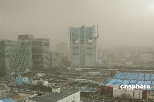 2月23日午后,東京出現(xiàn)大風(fēng)天氣,瞬間風(fēng)力達(dá)到15.9公里,一時(shí)間,黃沙漫天。圖為東京都港區(qū)的高層建筑群浸潤在黃色沙塵中。中新社發(fā) 滕劍峰 攝