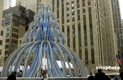 由兩名英國(guó)藝術(shù)家創(chuàng)作的“電子噴泉”街頭裝置藝術(shù)品于27日在紐約著名的洛克菲勒中心廣場(chǎng)揭幕。這個(gè)重達(dá)6萬(wàn)多磅的鋼筋噴水池裝點(diǎn)了3390顆燈泡來(lái)模擬噴水狀態(tài),“水柱”最高達(dá)10米多。中新社發(fā) 鄧悅 攝