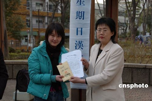 3月9日,日本東京漢語角舉行的第30次交流會(huì)上,日本僑報(bào)社社長(zhǎng)張景子(右)代表中日兩國的捐款者,把全部捐款和寫給湖南省長(zhǎng)周強(qiáng)的信,轉(zhuǎn)交給了正在日本訪問的湖南省人民對(duì)外友好協(xié)會(huì)干部曾卓然(左),表達(dá)大家對(duì)湖南災(zāi)區(qū)人民的關(guān)切之情。近一個(gè)月來,日本僑報(bào)社組織的為湖南災(zāi)區(qū)人民捐款活動(dòng),共收到4個(gè)團(tuán)體、53位日本友人和在日華人的全部捐款38.2885萬日元。中新社發(fā) 段躍中 攝