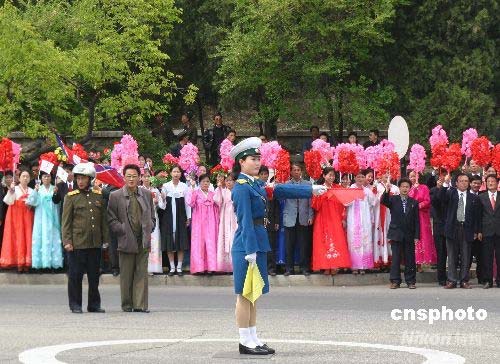 4月28日上午10時許,北京奧運圣火在朝鮮首都平壤開始傳遞。北京奧運圣火在平壤的傳遞,從主題思想塔出發(fā),途徑中朝友誼塔、千里馬雕像、凱旋門等主要景點,最終在金日成體育場舉行慶典儀式。圖為平壤女交警在傳遞路線上指揮交通。 中新社發(fā) 沈晨 攝