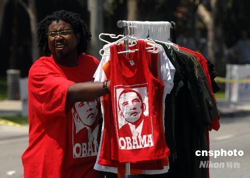 洛杉磯一名非裔小販在街頭兜售印有奧巴馬頭像的背心和T恤衫。目前,奧巴馬已穩(wěn)獲美國民主黨總統(tǒng)候選人提名,他得到了美國大多數(shù)非裔選民的強力支持。中新社發(fā) 張煒 攝