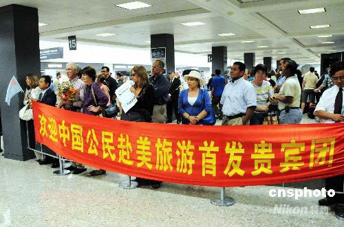 當(dāng)?shù)貢r(shí)間六月十七日晚,中國公民赴美旅游首發(fā)團(tuán)抵達(dá)華盛頓杜勒斯國際機(jī)場(chǎng),美國商務(wù)部、機(jī)場(chǎng)所在地郡政府和當(dāng)?shù)芈糜紊缭跈C(jī)場(chǎng)等待迎接首發(fā)團(tuán)到來。該團(tuán)在華盛頓將破例受到美國商務(wù)部重視,將以有史以來最高接待規(guī)格接待中國旅游團(tuán),為他們安排高規(guī)格行程。古鐵雷斯部長(zhǎng)將親自接待二百四十名中國游客。中新社發(fā) 邱江波 攝