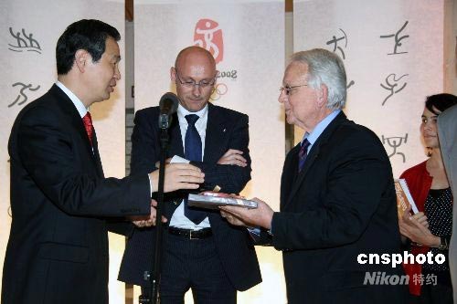 六月十九日晚,法國奧委會(huì)在巴黎舉行慶祝北京奧運(yùn)會(huì)迎來倒計(jì)時(shí)五十天儀式。圖為中國駐法大使孔泉(左一)向法國奧委會(huì)主席塞朗杜(左三)贈(zèng)送法文版新書《二00八北京奧運(yùn)建筑》。 中新社發(fā) 吳衛(wèi)中 攝