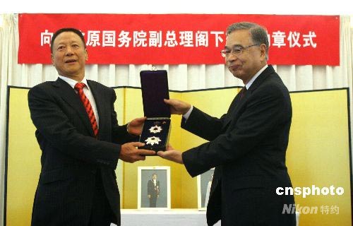 6月30日,日本授予中國前國務(wù)院副總理谷牧(本名劉家語)先生旭日大勛章。谷牧也是第二位被授予這一榮譽的中國人。圖為日本國駐華大使宮本雄二(右)向谷牧先生長子贈送勛章。谷牧先生本人因身體原因未能出席本次授勛儀式。中新社發(fā) 富田 攝