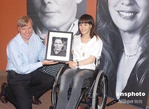 正在美國進行“感恩之旅”的桑蘭7月15日前往位于新澤西的克里斯托弗-達納里芙基金會拜會老朋友。該基金會是由“超人”的扮演者克里斯托弗和其妻子共同創(chuàng)立的。圖為克里斯托弗-達納里芙基金會會長彼得·威爾德洛特向桑蘭贈送“超人”克里斯托弗紀念照。中新社發(fā) 管黎明 攝