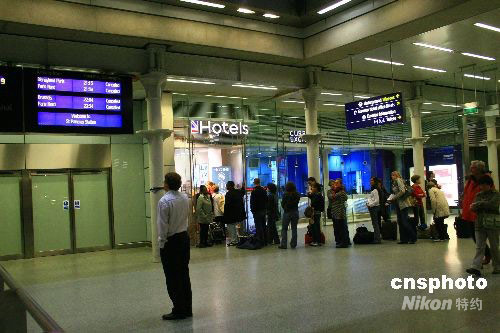 圖為11日晚,警察封鎖了歐洲之星火車的出發(fā)站臺,現(xiàn)場有乘客焦急等候。