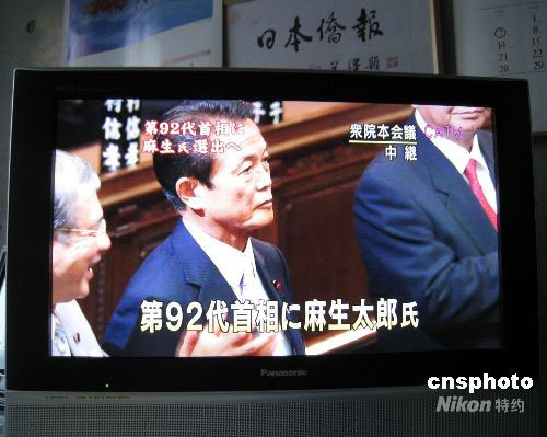 東京時(shí)間9月24日下午5時(shí),日本自民黨新總裁麻生太郎在臨時(shí)國會(huì)首相指名選舉中當(dāng)選日本第92代日本首相。圖為當(dāng)選瞬間的麻生太郎。中新社發(fā) 段躍中 攝