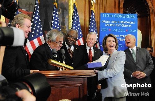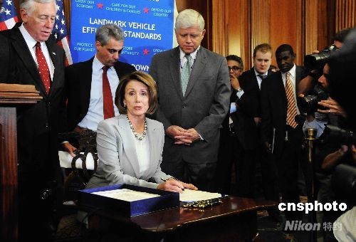 圖為眾議長南希·佩洛西(坐者)在國會其他領(lǐng)袖的陪同下簽署了這個剛剛通過的方案。