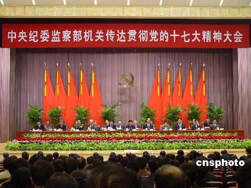 十月二十四日上午,新任中共中央政治局常委、中央紀(jì)委書記賀國強出現(xiàn)在中紀(jì)委機關(guān)大禮堂,與中央紀(jì)委監(jiān)察部機關(guān)的黨員干部見面。中共中央紀(jì)委監(jiān)察部當(dāng)日召開機關(guān)全體黨員干部大會,傳達(dá)學(xué)習(xí)黨的第十七次全國代表大會精神,賀國強出席會議并講話。中新社發(fā) 孫宇挺 攝