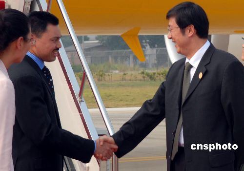 十月二十六日下午,文萊王儲(chǔ)比拉(左二)飛抵廣西南寧市,出席將于十月二十八日開幕的第四屆中國(guó)—東盟博覽會(huì)。圖為文萊王儲(chǔ)比拉在南寧國(guó)際機(jī)場(chǎng)受到廣西自治區(qū)黨委宣傳部長(zhǎng)沈北海等廣西官員的歡迎。中新社發(fā) 蔣雪林 攝