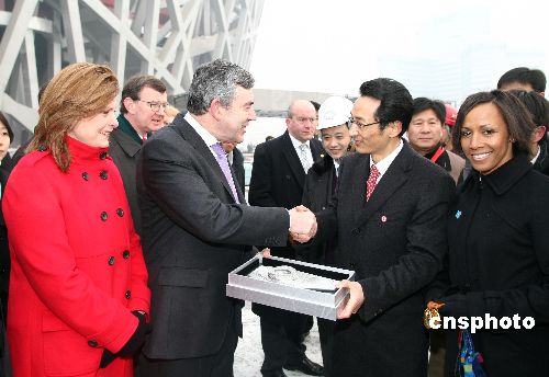 1月19日,英國首相布朗攜夫人薩拉·布朗以及英國著名女運動員、雅典奧運會冠軍凱莉·霍爾姆斯等,參觀2008年北京奧運會主體育場“鳥巢”。北京市副市長陳剛向布朗贈送了“鳥巢”模型。中新社發(fā) 盛佳鵬 攝